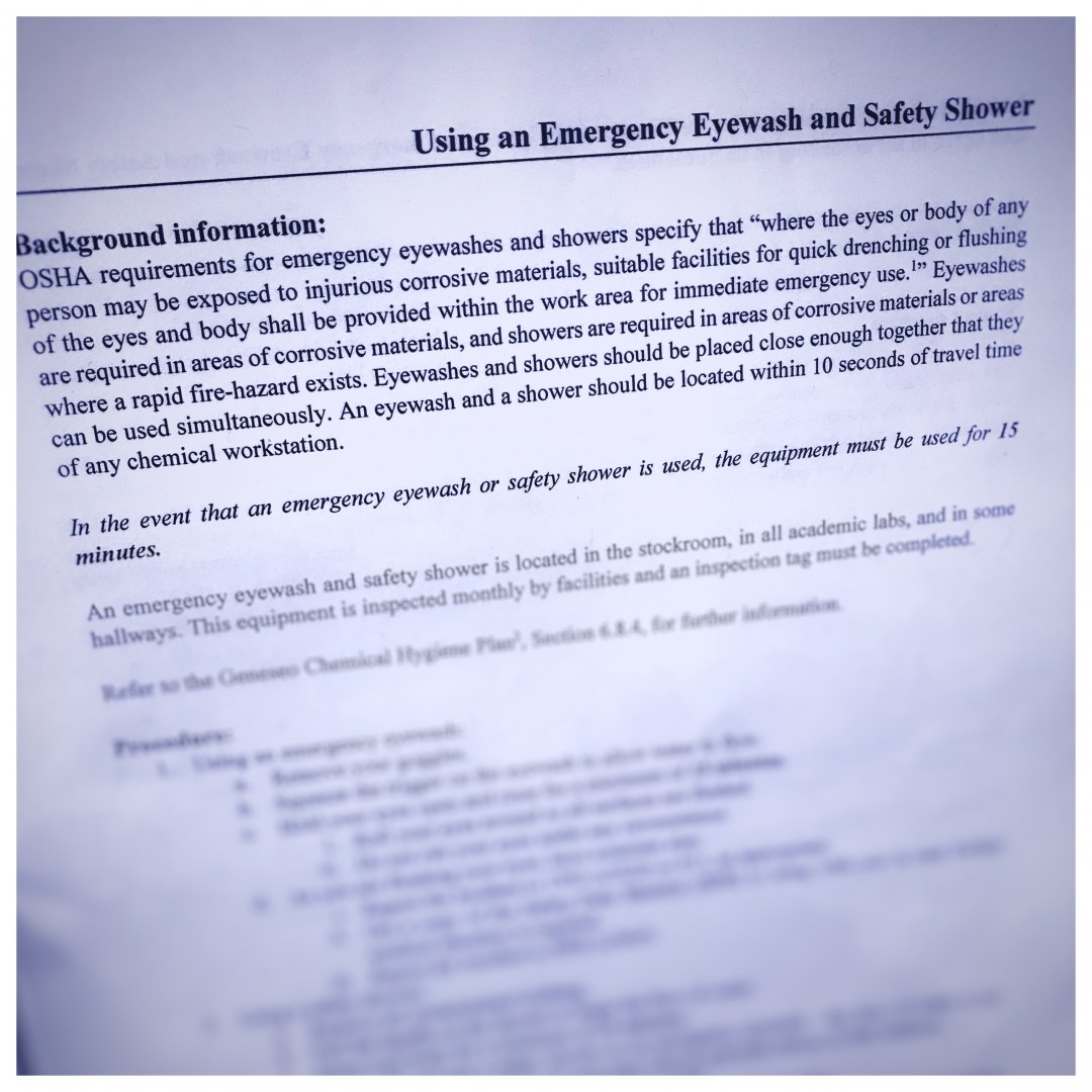 The below listed SOPs and training documents are examples of some of the training Geneseo students receive during their student employment careers at the Chemistry Stockroom, helping to safely and thoroughly prepare them for the rigors of laboratory facilities and experiment preparation with setup, synthesis, and evaluation of course experiment chemicals and materials. In order to meet strict syllabus timelines, stockroom students learn how to: communicate effectively while gaining direct experience in lab documentation and chemical synthesis review, analyze raw data generated, and ensure accuracy, consistency and completeness for all of our undergraduate academic chemistry labs.