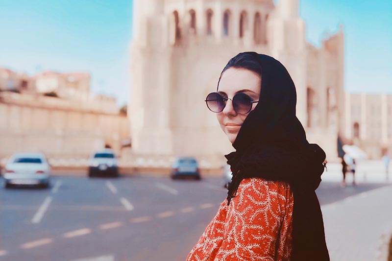 Cate Shields ’19 outside Heydar Aliyev Mosque
