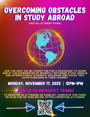 Join the SUNY CIE DEI Committee for a virtual discussion to learn about the experiences of recently returned study abroad and international students, including obstacles they have overcome in their journey.