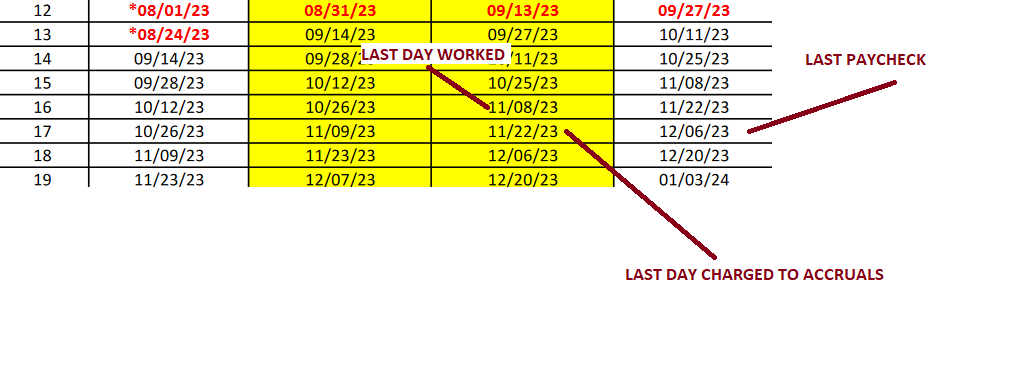 Your last paycheck is based on your last day on our payroll. To determine what your last paycheck will be, you’ll need the correct current Administrative Payroll Calendar. Below is an example on how to determine when your last paycheck will be. As always, call us for help!