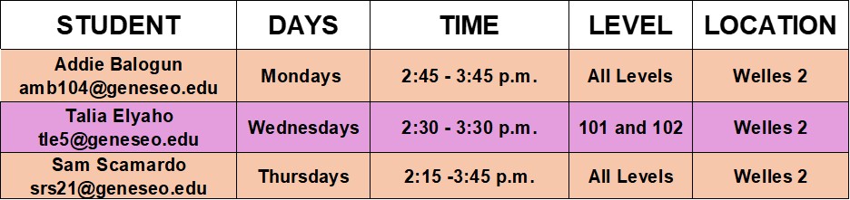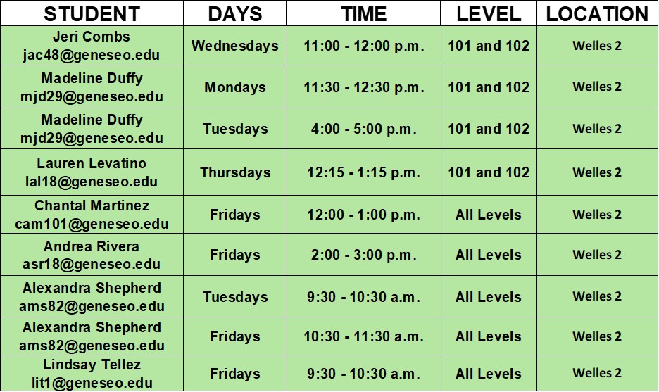 Free tutoring services are available in person this semester to all students enrolled in French and Spanish courses at Geneseo. Student tutors (members of the various foreign language clubs) provide individual tutoring. Tutoring is available primarily to students enrolled in the Department’s 101- and 102-level courses but some tutors can also assist students at the intermediate and advanced levels. Tutors will help with vocabulary, speaking practices, explanations of grammar, or correction suggestions from edits on papers but will not correct students’ work for classes or do assignments for them. To meet with a tutor, please email the tutor or simply walk in (Welles 2) based on their availability and the level of the class you are taking.