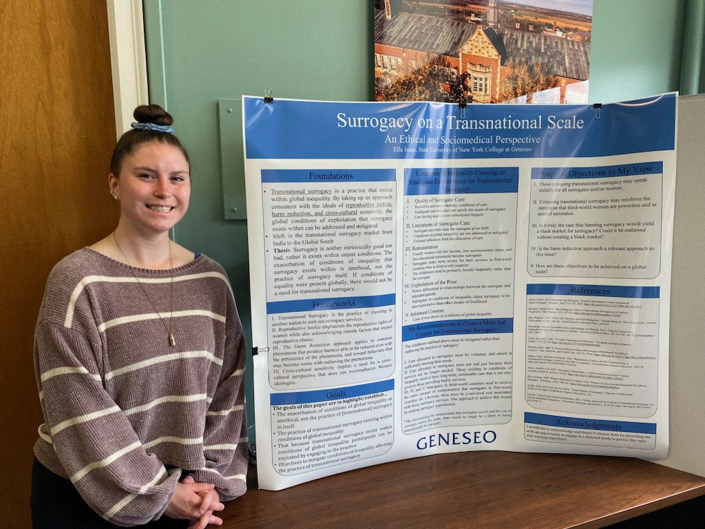 Ella Isaac '24, a Sociomedical Sciences major, presents a poster on her research into transnational surrogacy. Dr. Amanda Roth of the Philosophy Department supervised her research.
