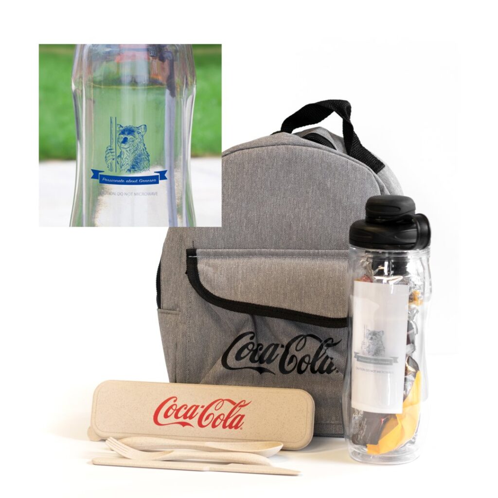 Bundle includes; our reusable water bottle branded with the custom Geneseo Bear Fountain landmark. Our sustainable lunch bag made from recycled water bottles (rPET 1% purchase donated to non-profits helping protect the planet), and eco-friendly reusable wheat straw utensils (a portion of the proceeds goes to Project Aware.