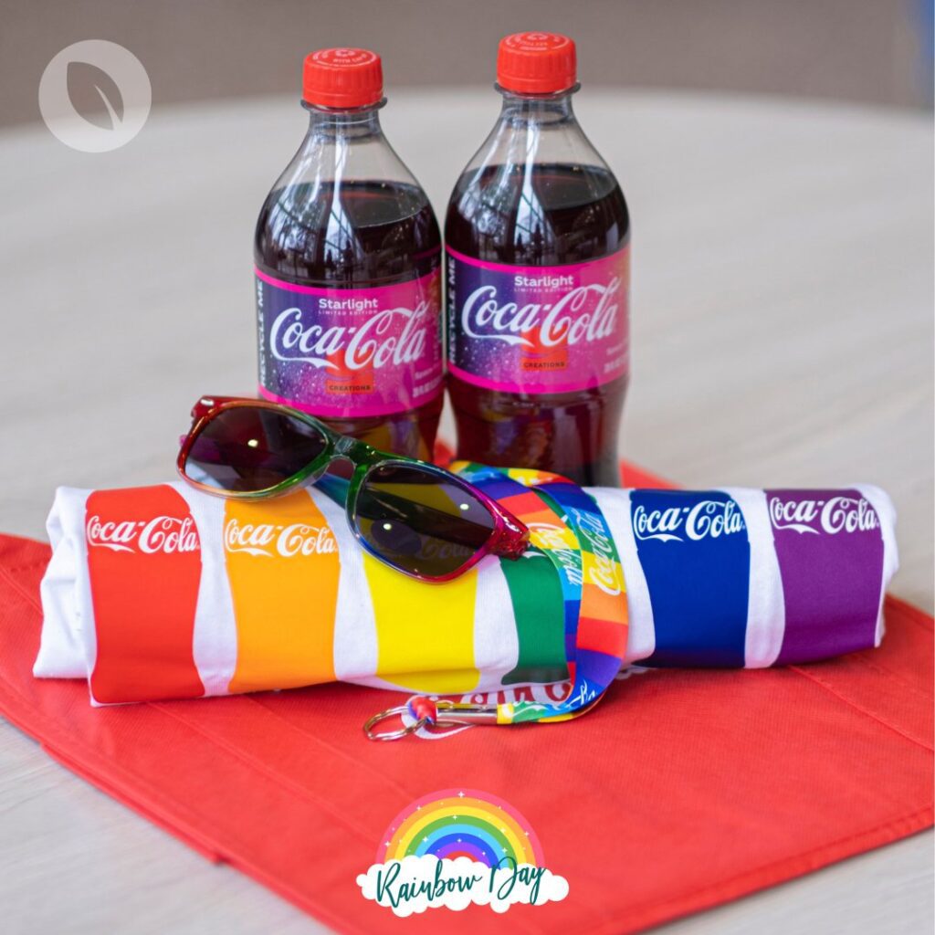 Bundle includes; rainbow Coca-Cola t-shirt, sunglasses, and lanyard, two 20oz Coca-Cola Starlight, tote bag, skittles, and rainbow lollipop.